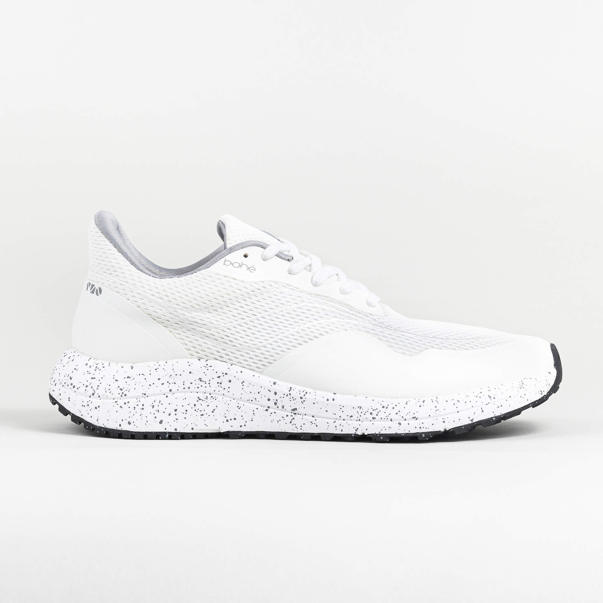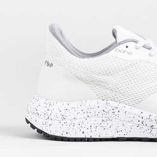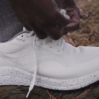 Bahé Recharge grounding shoes in Frost (white) worn by woman tying laces
