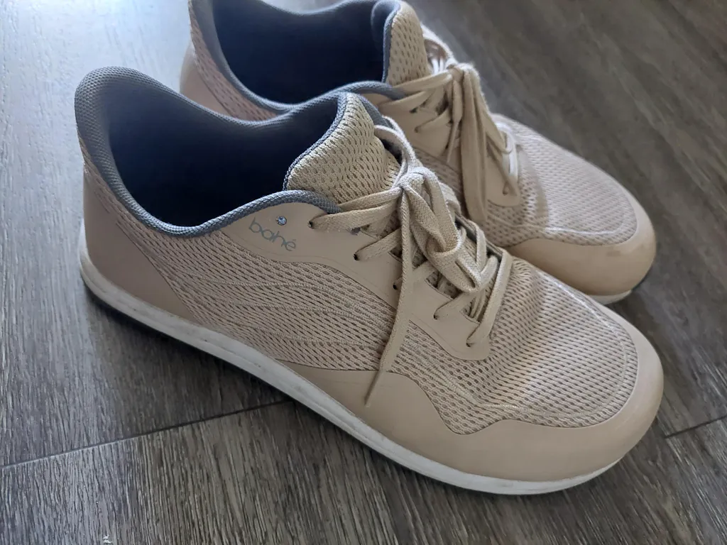 Woman wearing Bahé Revive barefoot style grounding shoe (Sandstone - beige) in nature